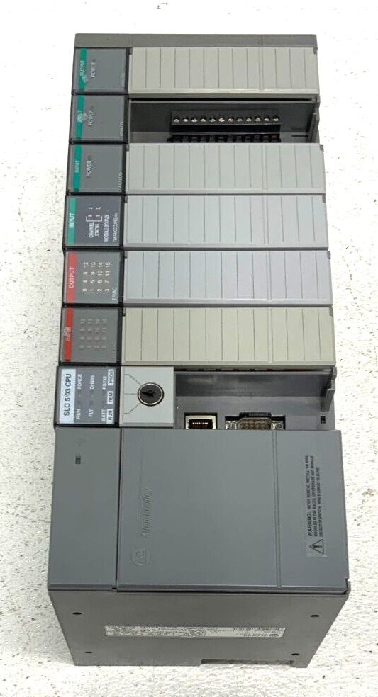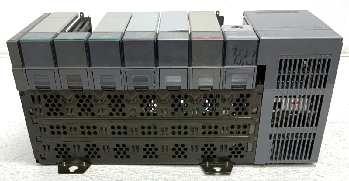 For sale by Equipment Recycle is an Allen Bradley 1746-A7 SLC-500 7-Slot Rack SLC-5/03 Power Supply PLC Controller. This is a 7-slot loaded rack with a power supply. The power supply is a series C and the controller is a series B. This unit is 85-132VAC/170-265VAC and 50/60Hz. This item was removed from a local manufacturing plant. There is a crack on the side of the unit. The power supply and one of the modules are missing the cover. Please see photographs for clarification. Please be sure to see our other listings for many more Allen Bradley products including the 2711-K5A2 PanelView 550 Operator Interface Panel. Here is your chance to own this for a fraction of retail. Please email us with any questions you may have, we are here to help.