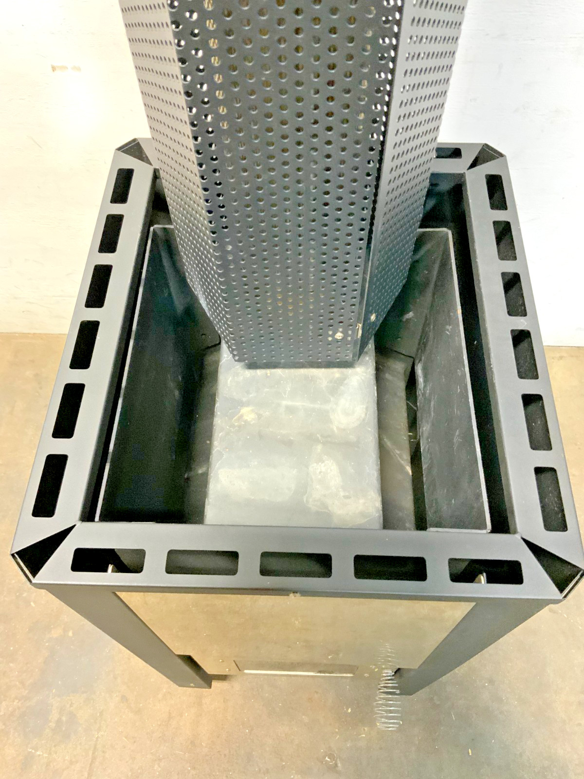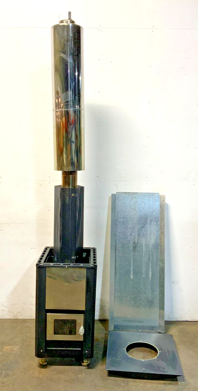 For Sale by Equipment Recycle is an Alpha Sauna Wood Burning Fired Sauna Thermal Stove Heater w/ Chimney. There is not data plate on this unit, so we are unsure of the exact model and specs. This item was removed from a working sauna. The top of the chimney was cut down slightly to fit the sauna’s layout. This unit is working and mostly assembled. Only the chimney would need to be added as it is shown in the photographs. There may be some normal wear and tear on the stove from use with the previous owner. Please see photographs for clarification. Here is your chance to own this for a fraction of retail! Please email us with any questions you may have! We are here to help!