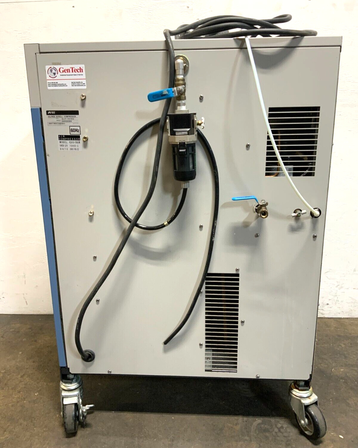 For Sale by Equipment Recycle is an Anest Iwata KZA1S-156C SLP-151ED Oil Free Scroll Air Compressor N2/Zero Air Generator. This was manufactured in 2007. The compressor is 125/250V, 60Hz, and 30A. The generator is 100VAC and 50/60Hz. The generator does not come with a power cord. This item was removed from a local laboratory. It was pulled from a working environment. There may be some light wear on this item from use with the previous owner. The scroll compressor has some scratches on the back. It is in good used condition. Please see photographs for clarification. Here is your chance to own this for a fraction of retail! Please email us with any questions you may have! We are here to help!