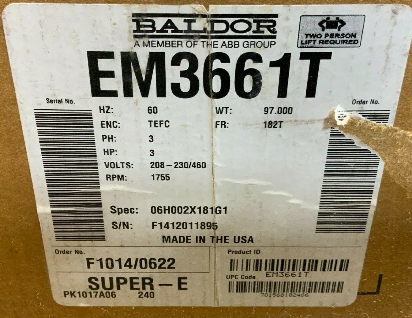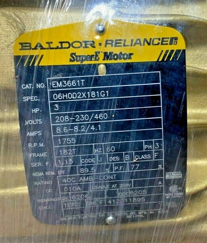 Baldor EM3661T 3HP 208-230/460V 8.6-8.2/4.1AMPS 1755RPM 60HZ 3PH #3 G7C