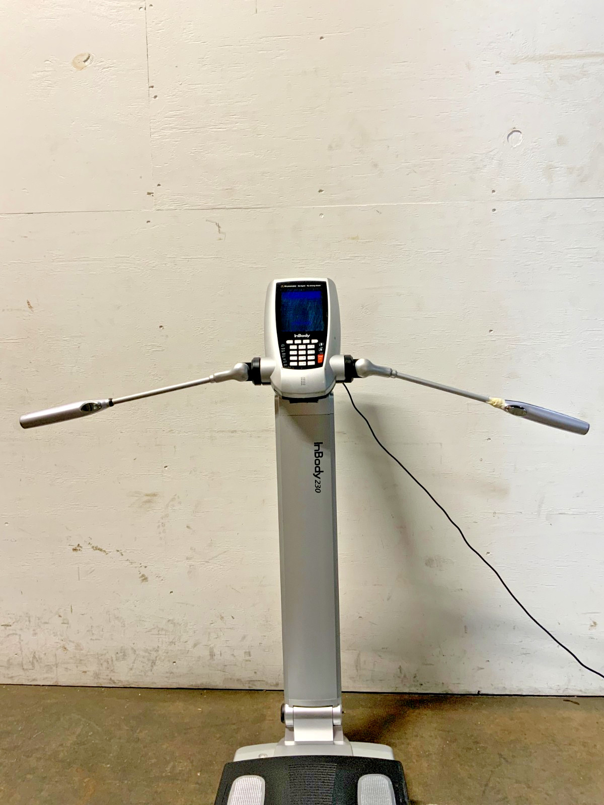 For sale by Equipment Recycle is a BioSpace InBody 230 Body Composition Analyzer Scale. This unit does not come with the power adapter. This item was removed from a government surplus facility. It powers on and is operational. There may be some scratches or chipped paint on it from normal use with the previous owner. It is missing a screw cover by the base. The right handle is cracked/broken and held together with tape and it does not stay elevated by itself at times. Please see photographs for clarification. Here is your chance to own this for a fraction of retail. Please email us with any questions you may have, we are here to help.