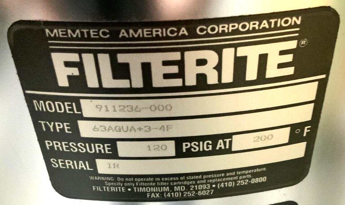 Home Other Filterite Memtec 911236-000 63AQUA+3-4F Cartridge Filter Housing 120PSI I12A