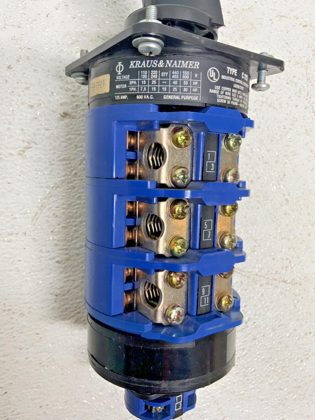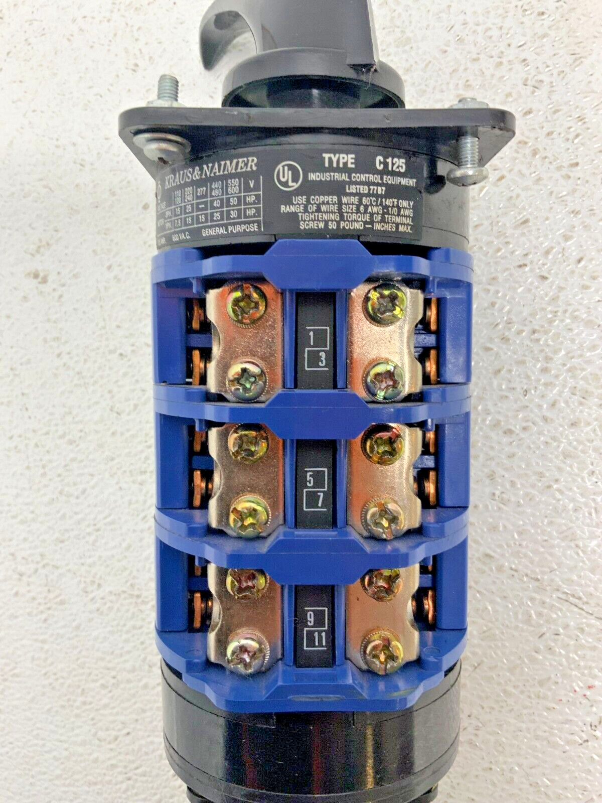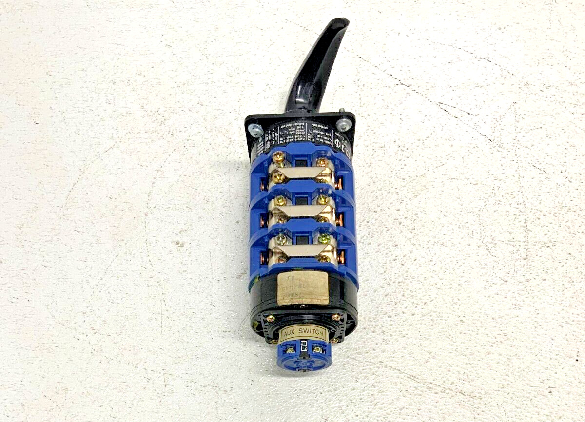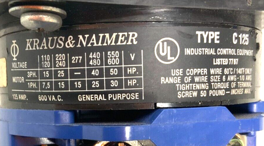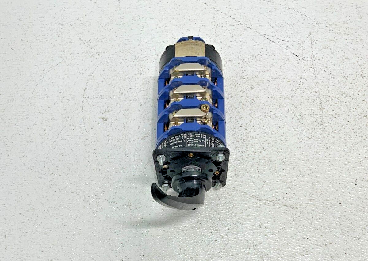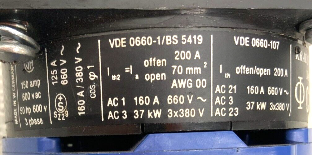 For sale by Equipment Recycle is a Kraus & Naimer C125 VDE 0660-1/BS 5419 Rotary Cam Switch Screw Terminal Block. This switch is 150A, 600VAC, 50HP, and 3PH. Model numbers listed on this item are C125, VDE 0660-1/BS 5419, and VDE 0660-107. This item was removed from a local manufacturing plant. It was pulled from a working environment. There may be some wear or residual material on it from normal use with the previous owner. It is in good used condition. Please see photographs for clarification. Here is your chance to own this for a fraction of retail. Please email us with any questions you may have, we are here to help.