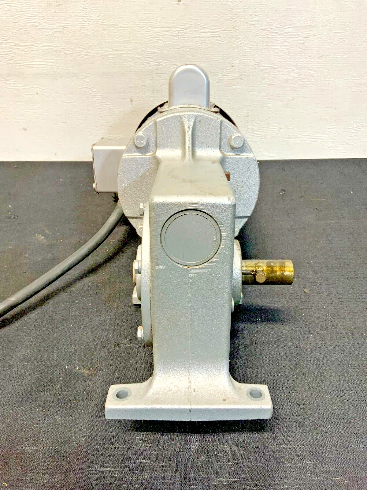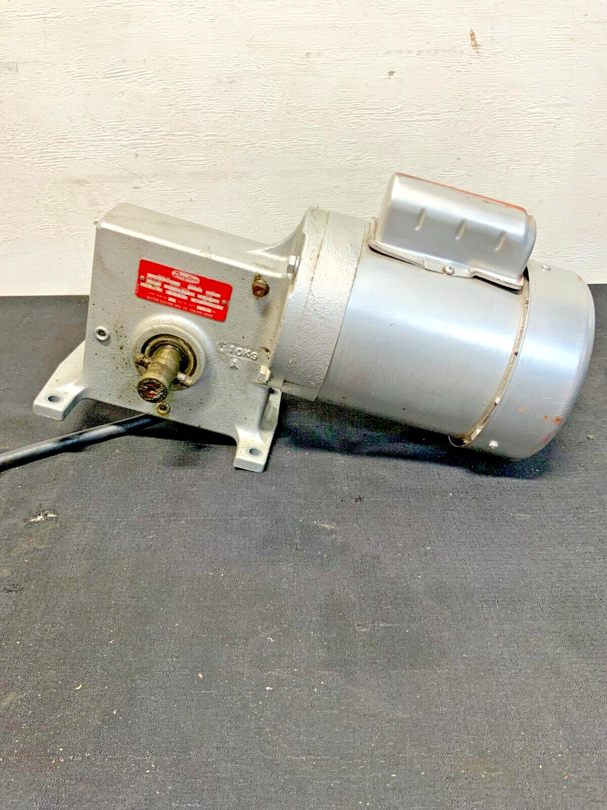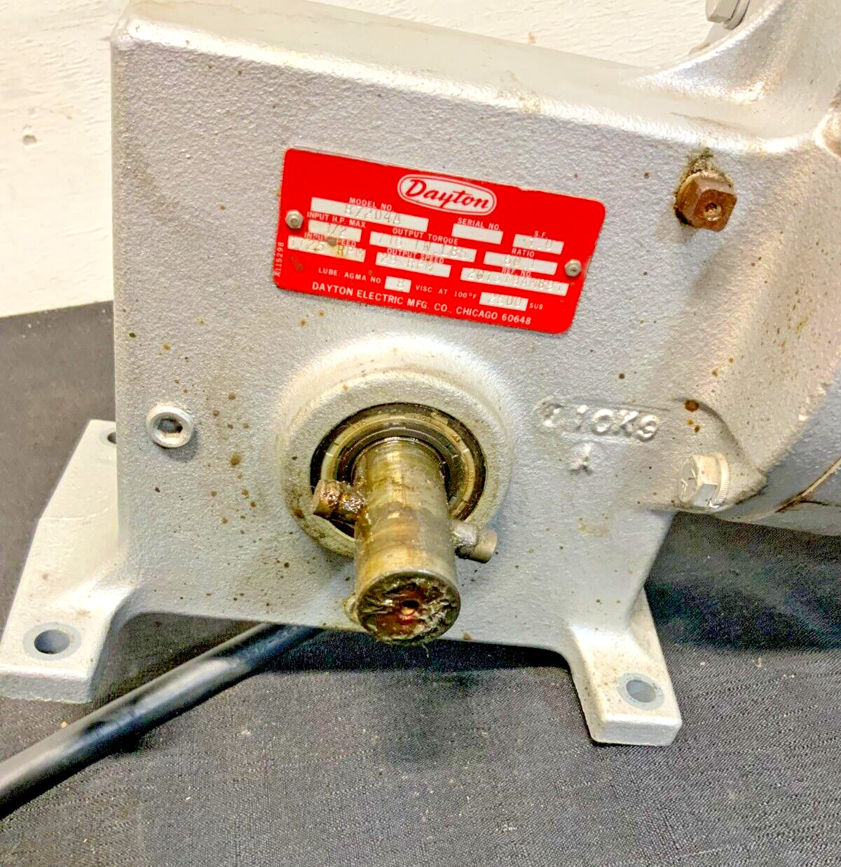 For sale by Equipment Recycle is a Leeson Dayton 111639.00 8Z204A Electric Motor Reducer. This unit is a Leeson 111639.00 motor, Dayton 8Z204A reducer, and Cutler-Hammer 9441H268C switch/control. The motor is 115//208-230V, 1725RPM, 3/4HP, 10.8//5.4F.L.A., 60Hz, 1PH, and has a  D56C frame. The reducer is 1/2HP, 716InLbs torque, 60:1 ratio, 1725RPM in, and 29RPM out. The switch is 115-230V and 1-1/2//2HP. The shaft coming out of the reducer measures about 1-1/8″ in diameter and 2-1/8″ long. This item was removed from a local dry cleaners. It was taken off of a carpet hoist. This unit powers on and is operational. There may be some scratches, chipped paint, or residual material on it from normal use with the previous owner. There are 2 small dents in the motor casing. Please see photographs for clarification. Here is your chance to own this for a fraction of retail. Please email us with any questions you may have, we are here to help.