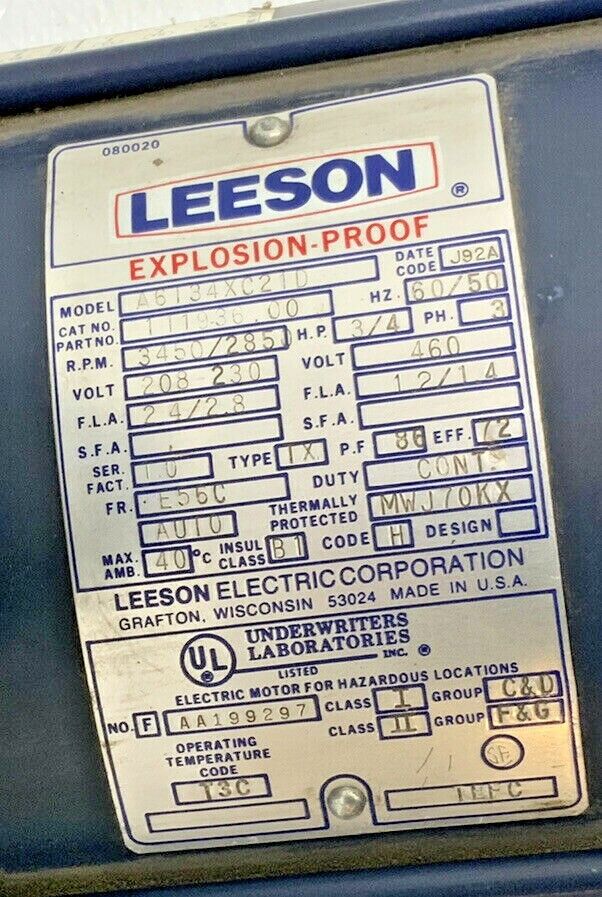 For Sale by Equipment Recycle is a Leeson Electric Motor A6134XC21D 208-230V 3PH 3450/2850RPM 60/50HZ. This item is used in good condition with some dust form storage. The item was pulled from a working environment. Here is your chance to own this for a fraction of retail! Please let us know if you have any questions! We are here to help!