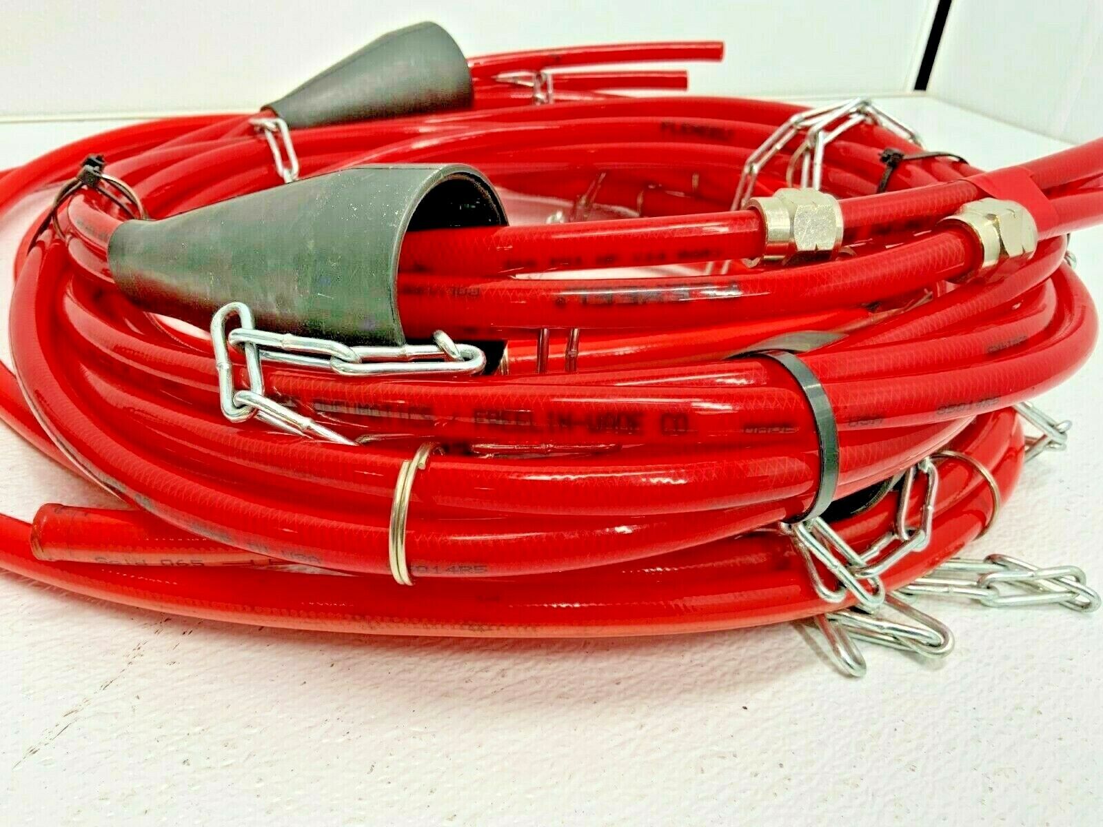 For sale by Equipment Recycle is a Lot of 2 Pneumatic Hoses Coilhose Flexeel Toytox Hit 8.5 x 12.5. These items were removed from an automotive manufacturer’s equipment shelf and are previously used. One hose is a Coilhose Pneumatics/Freel IN-WADE Co. 200 PSI (14 Bar) Flexeel hose with chain. The other is a Toytox Hit 8.5 x 12.5 WP 1.5MPa, made in Japan, hose. Each line has 3 hoses like it is set up for 3 button pendant. Please see photos for specifics. Here is your chance to own this for a fraction of retail. Please email us with any questions you may have, we are here to help.