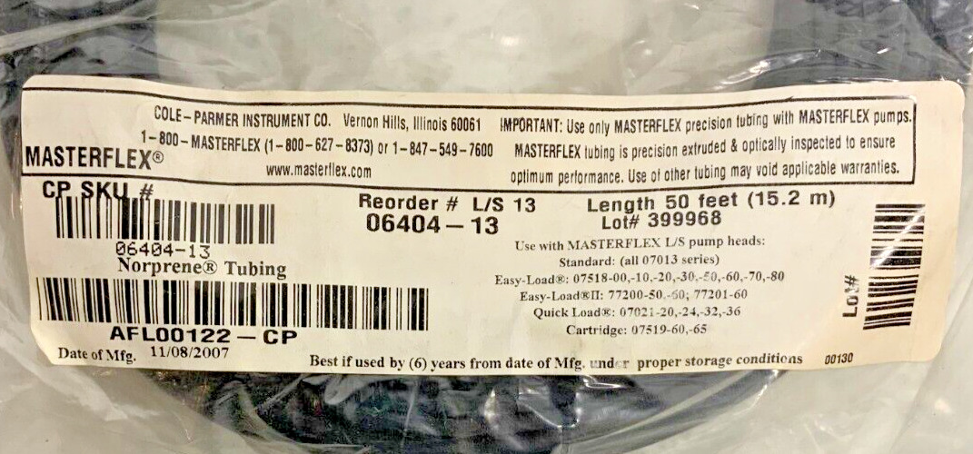 For sale by Equipment Recycle is a MasterFlex AFL00122-CP 50ft Precision Pump Norprene Tubing L/S 13. This item was removed from a weather instrument manufacturer and is in great condition. It is un-opened and still in its original packaging. Here is your chance to own this for a fraction of retail. Please email us with any questions you may have, we are here to help.