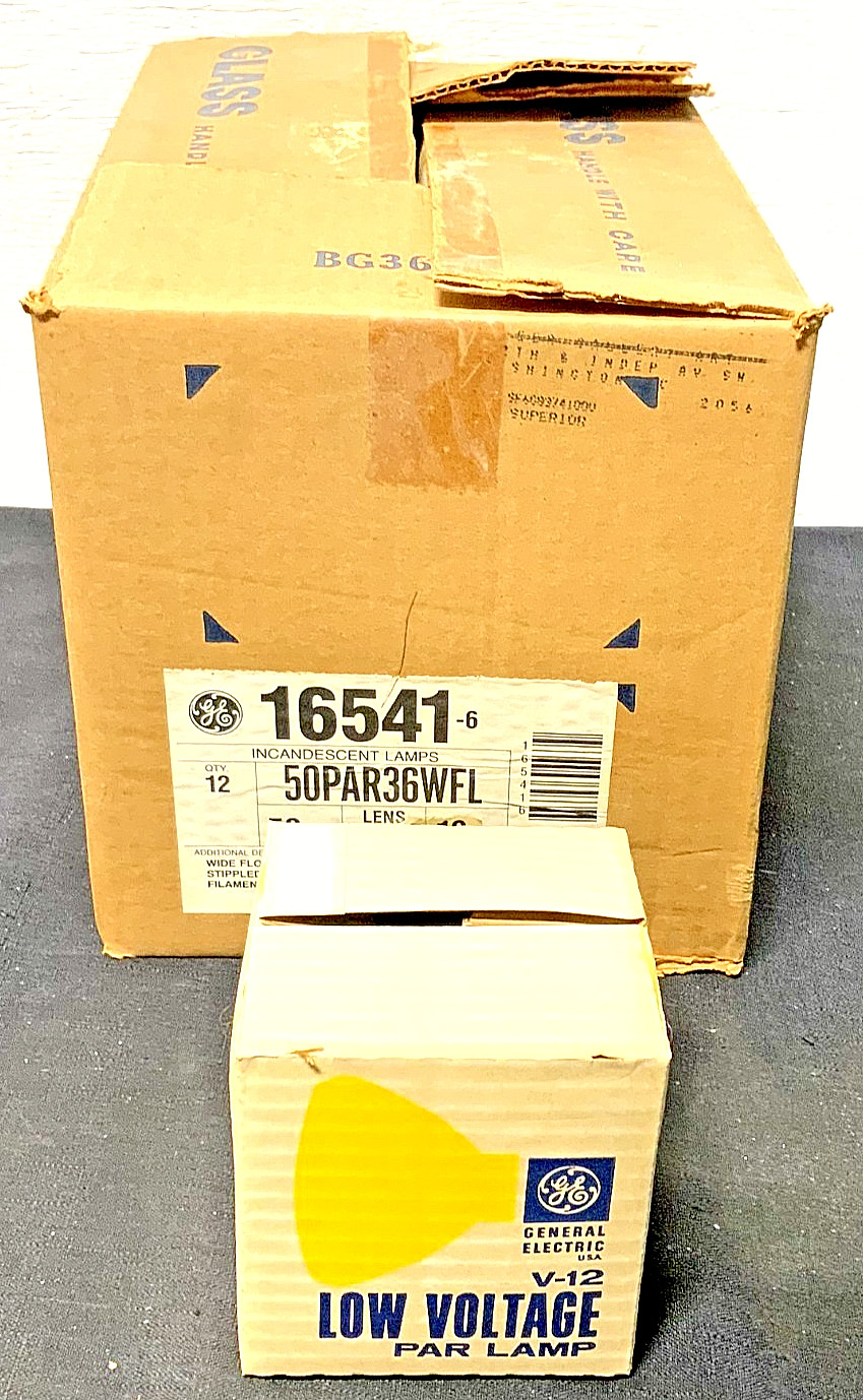 For sale by Equipment Recycle is a NEW Lot of 12 GE 16541 Low Voltage Par Lamp 50PAR36/WFL with 50Watts and 12Volts. These items were removed from a local government surplus facility. They are new and come in the original box and packaging. Here is your chance to own this for a fraction of retail. Please email us with any questions you may have, we are here to help.