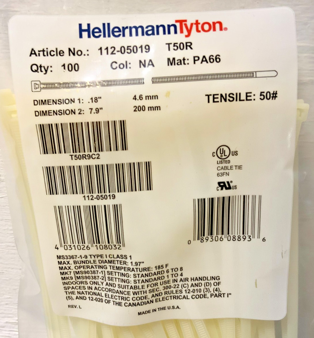Home Other NEW Lot of 1500 HellermannTyton 112-05019 T50R Natural Cable Tie 50Lb. 8″ 77B