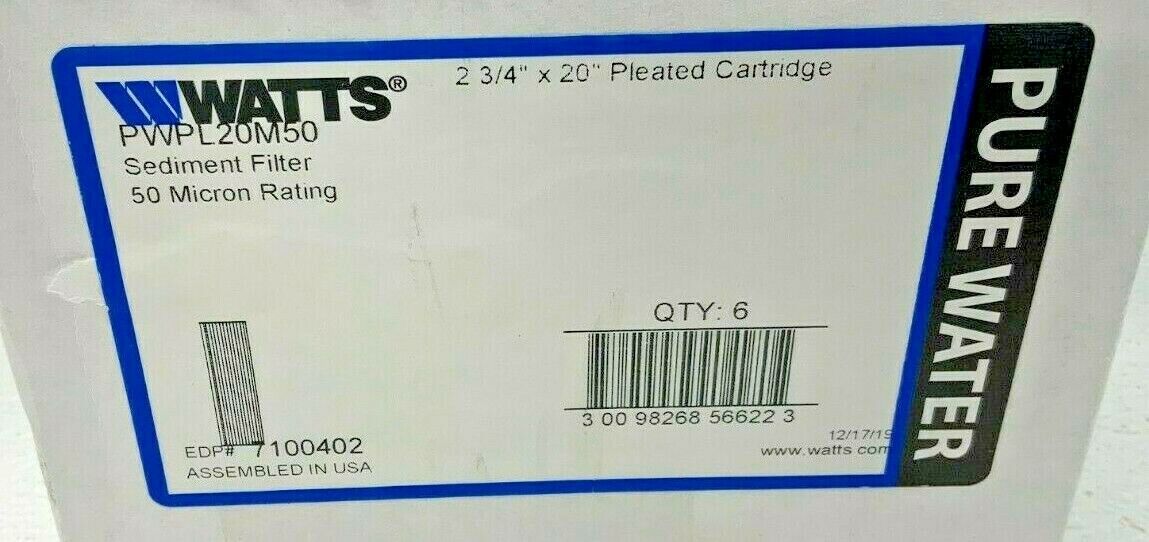 NEW Lot of 6 Watts PWPL20M50 Sediment Filters Pleated 20″x2 3/4″ 15E
