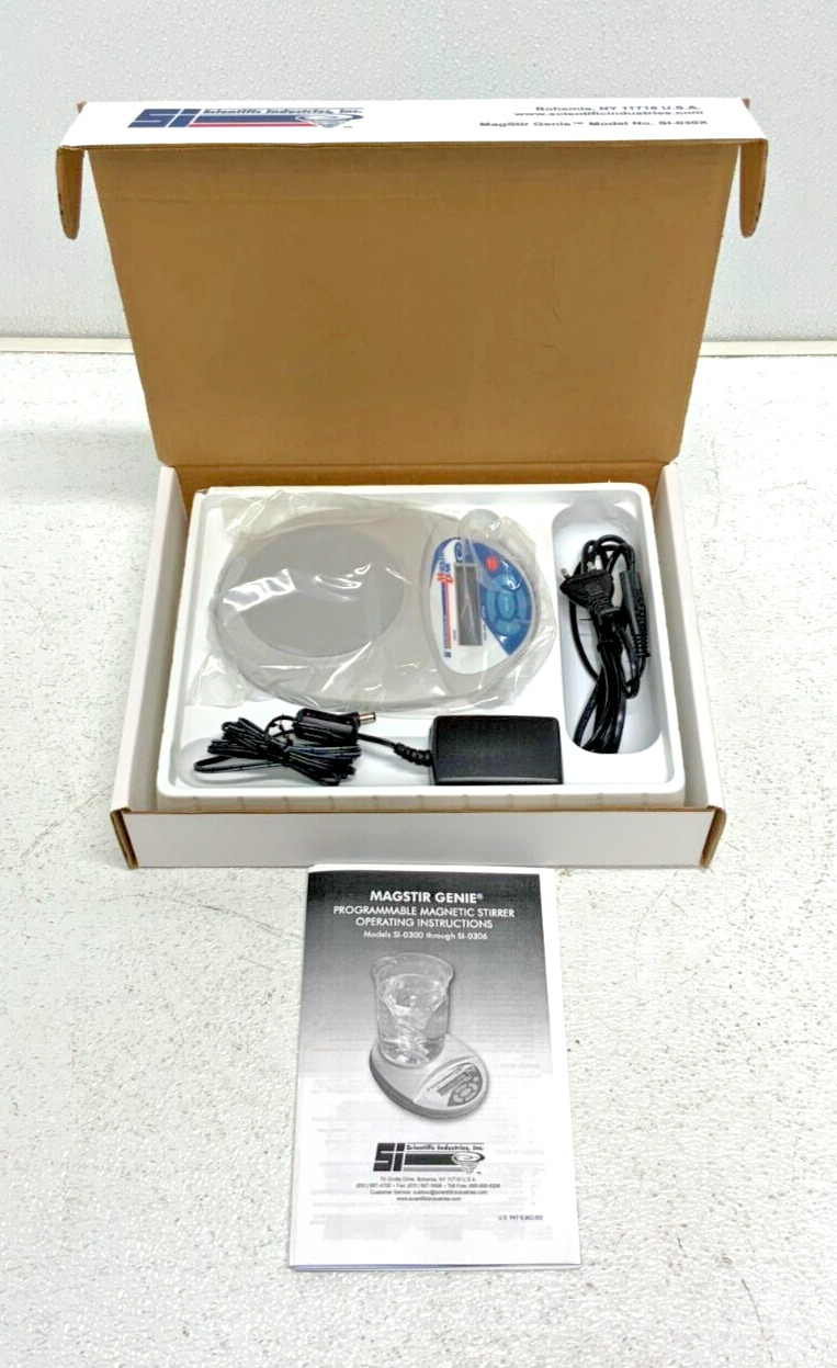 For sale by Equipment Recycle is a New Scientific Industries Magstir Genie SI-0302 030X Digital Magnetic Stirrer. This unit comes with a power adapter and cord, but the cord is for a non-traditional outlet. The cord can be easily swapped with a traditional one. It also comes with the manual. The specs on it are 12VDC and 1A. It was removed from a local laboratory. It is new and comes in the original box and packaging. Please see photographs for clarification. Here is your chance to own this for a fraction of retail. Please email us with any questions you may have, we are here to help.