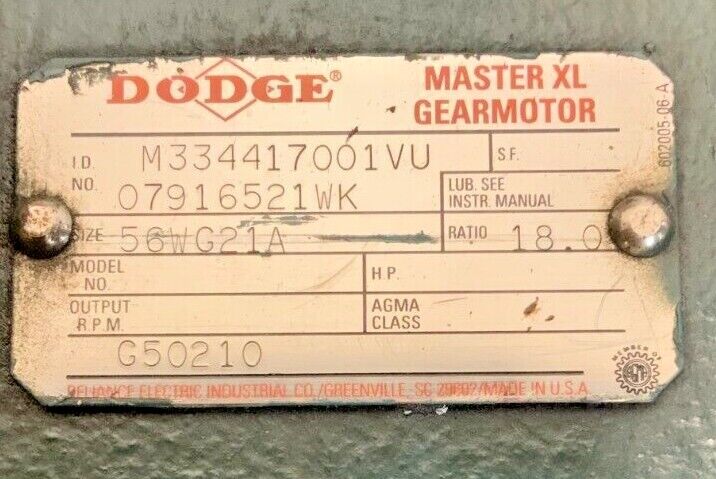 For Sale by Equipment Recycle is a Reeves Reliance Electric X-V MFC111 Moto Drive 1.5HP 18 Ratio 233RPM Max 25.9RPM Min output speed with Dodge M334417001VU Gear Motor and Reliance Duty Master A-C Motor. This item was removed from a local plant’s spare parts shelf. The oil may need to be replaced. There is some wear on this piece. Due to a marking on the data plate, the model number is not legible, but it seems to begin with “MFC111” and end with “39-QP”. There is a sticker on this item that states “Replaced 2/19/2017”. Please see photographs for clarification. Here is your chance to own this for a fraction of retail! Please email us with any questions you may have! We are here to help!