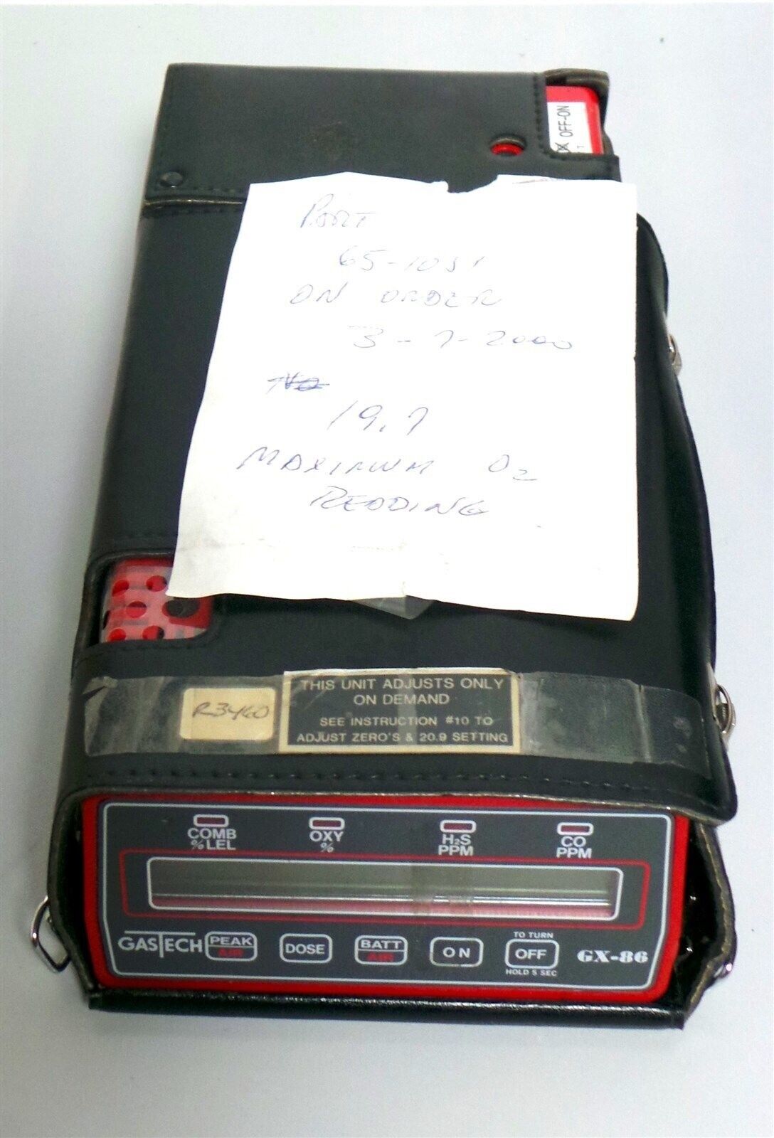 For sale by Equipment Recycle is a Riken Keiki GX-86 set. Unit does not power on, there is a note that reads : Part 65-10J1 on order 3-7-2000, 19.7 maximum O2 reading.  Please see pictures for all items included in this listing. Listing includes, meter, meter case,  cable, manual, and case. Here is your chance to own this for a fraction of retail. There are more details on this item below. Feel free to contact us with any questions.