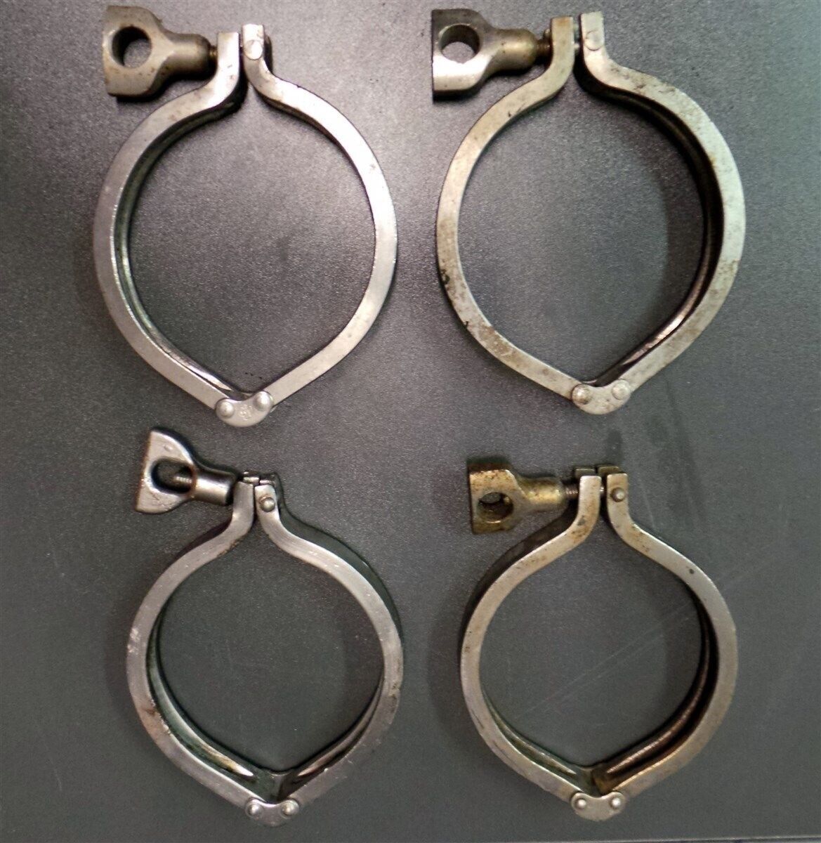 For sale by Equipment Recycle is a Lot of 4 Shamrock 304, and unknown brand, Stainless Steel Flask Joint Band Clamps. Some oxidation has occurred during storage.