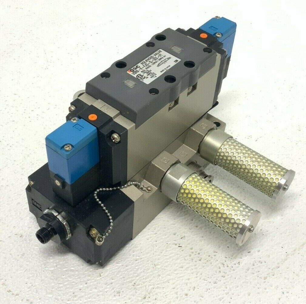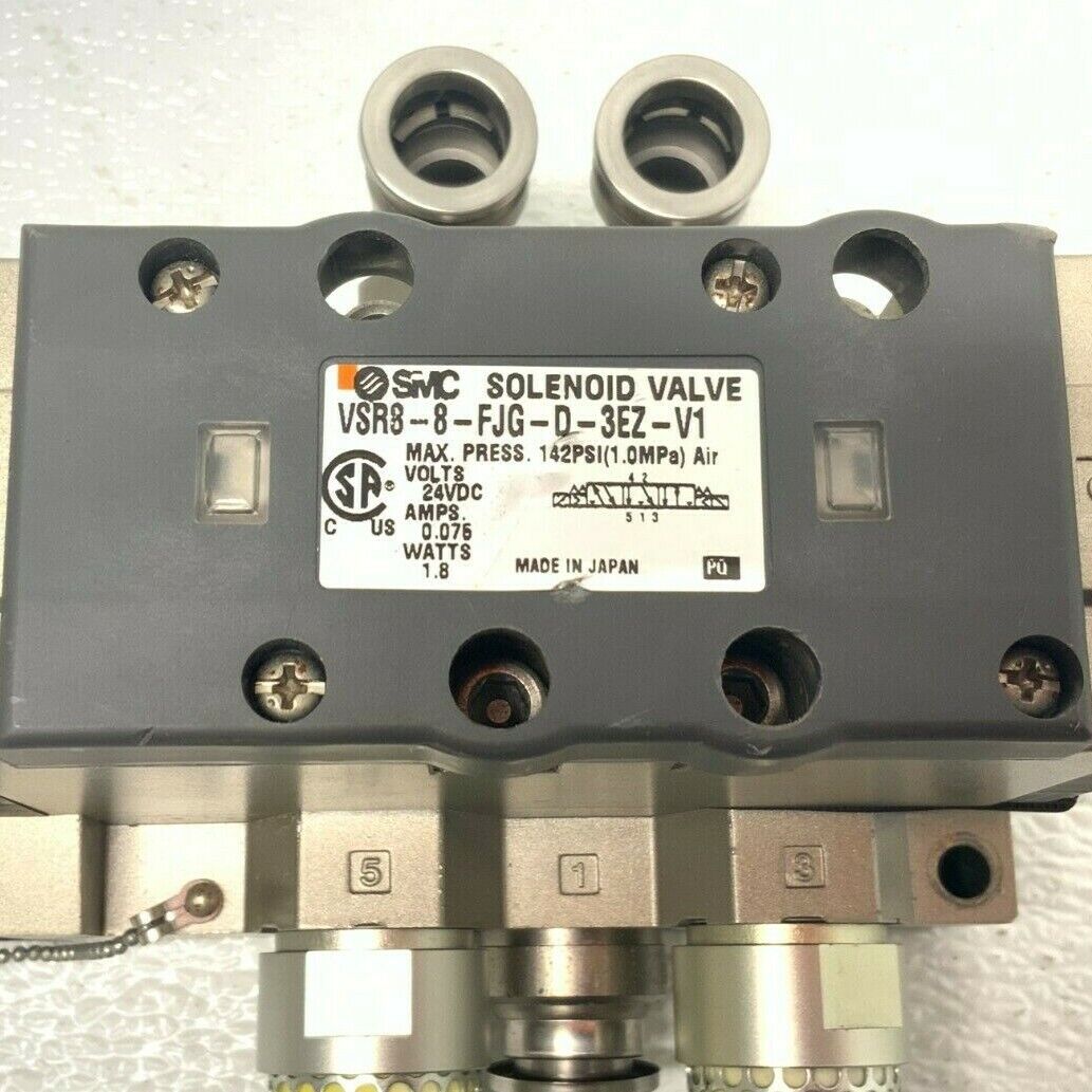 For sale by Equipment Recycle is a SMC VSR8-8-FJG-D-3EZ-V1 Pneumatic Solenoid Valve w/ ISO Plug-in Blue Coil. Item was removed from a local automotive plant assembly line. It was working when removed and there are no known issues. Here is your chance to own this for a fraction of retail! Please email us with any questions you may have! We are here to help!